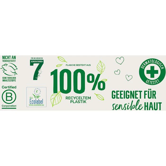 sonstiges: besteht zu 97 % aus pflanzlichen Inhaltsstoffen, frei von Farbstoffen, künstlichen Aufhellern und synthetischen Duftstoffen, für sensible Haut geeignet, nicht an Tieren getestet, enthält keine tierischen Inhaltsstoffe, Flasche aus 100% recyceltem Plastik